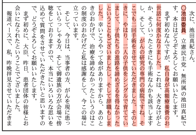 まず初めなんですが、私自身が高額療養費のお世話になったことが何度かなりました。これは、大きなけがとか、そういったときにも手術なんかも該当しますし、そして、がんの研究の専門の病院ですね、そこでも二回手術をさせていただきました。そのときに、やはり、二人の子供をシングルで育てていまして、子供たちの進路を諦めざるを得なかったということもございましたし、そして辞職もしました。幸いこうやって命がありますから、あのときのおかげで、治療を諦めなかったというのはこの制度のおかげだと私は感謝をして、今この場に立っています。①